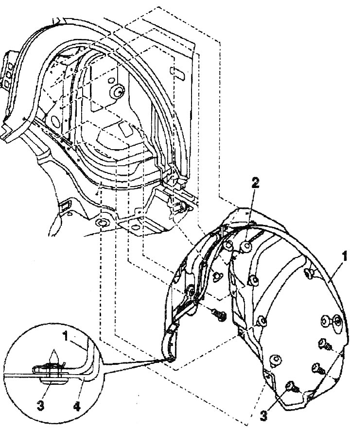 1. Передний подкрылок. Перед снятием демонтировать переднее колесо. Отвернуть болты. Вдавить штифты заклепок, вынуть заклепки и снять подкрылок с проема