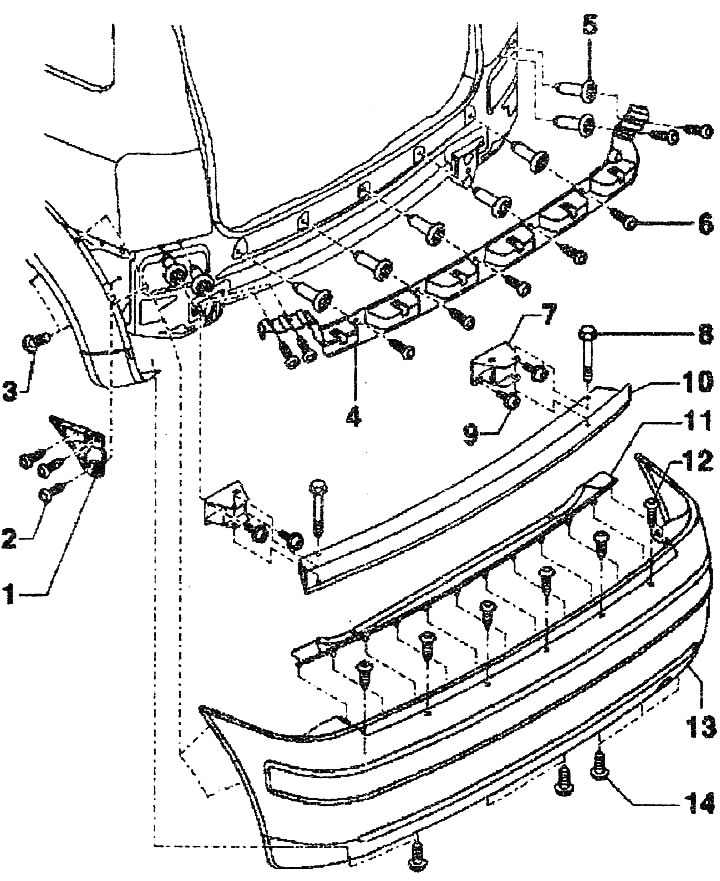 13. Крышка. Снять подкрылок в задней части. Отвернуть болты под подкрылком. А также болты в нижней части. Отсоединить накладку от крышки бампера. Вынуть крышку сбоку из направляющего профиля и снять крышку с а/м по направлению назад. При установке фиксаторы направляющего профиля должны защелкнуться в крышке