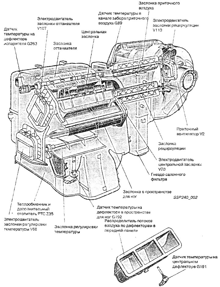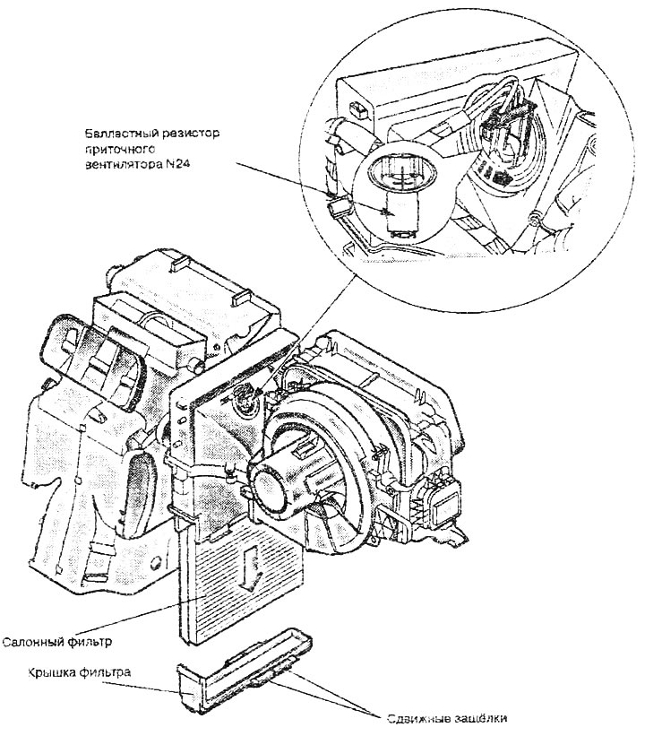 Салонный фильтр находится в гнезде, расположенном между приточным вентилятором и распределителем потоков воздуха. Его можно заменить из салона. Для того чтобы вынуть фильтр, необходимо удалить его крышку (сдвижные защелки). Для снятия балластного резистора приточного вентилятора N₂4 на автомобилях без климатической установки необходимо удалить вещевой ящик. После отсоединения разъёма балластный резистор вынимается поворотом против часовой стрелки. На автомобилях с климатической установкой балластный резистор отсутствует. Приточным вентилятором управляет блок J126. Для замены этого блока необходимо снять вещевой ящик и приточный вентилятор.
