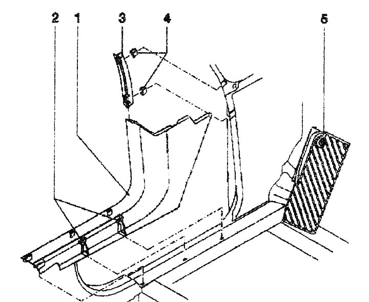 1. Облицовка нижней части стойки А. Вынуть перемычку «3» из зажимов «4» (2х). Движением вверх вытащить перемычку «3» и из облицовки. Расклипсовать облицовку «1» на зажимах «2» (3x). Вытащить облицовку «1» из-под облицовки стойки В. Вытянуть облицовку «1» назад из упора для ног «5»