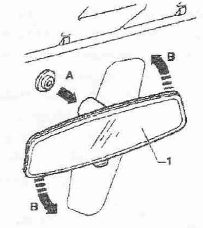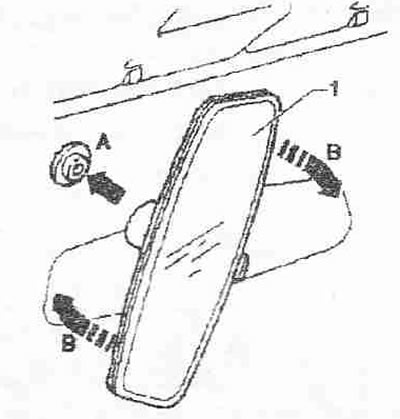 При снятии повернуть зеркало «1» на 60...90°. Крутить под 90° «стрелка В» так, чтобы фиксирующая пружина вышла из зацепления, и снять зеркало «стрелка А».
