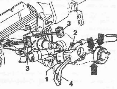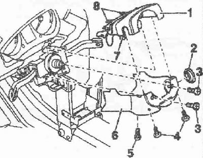 Открутить болт «4» (2 шт.). Момент затяжки 0,6 Нм. Снять вверх облицовку выключателя на рулевой колонке «1» и разблокировать сзади у зажимов «8».