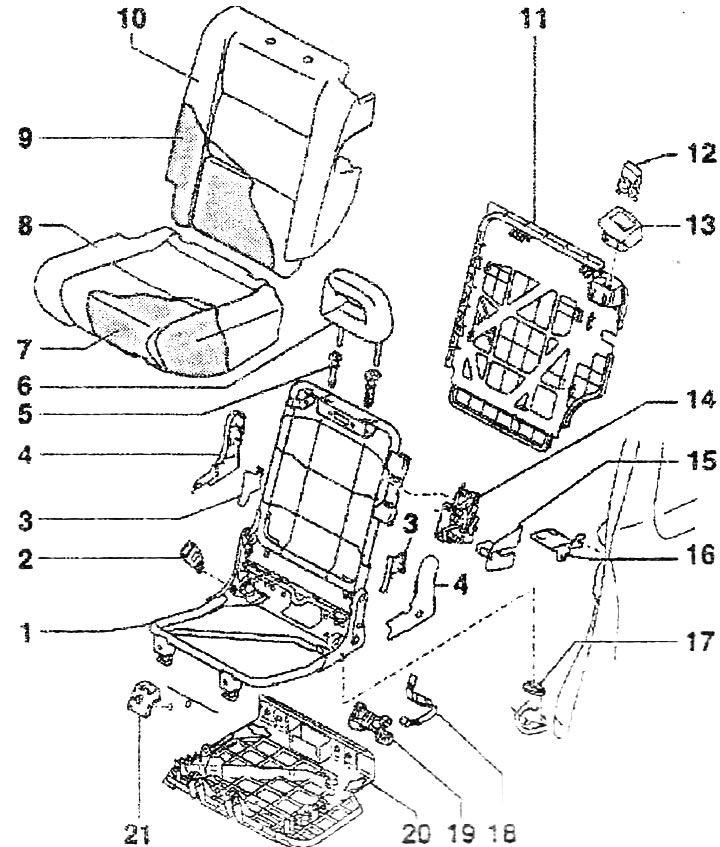 18. Затяжка. Только в а/м с багажником. Для дополнительной установки: приклепать нажимную кнопку к покрытию спинки сиденья