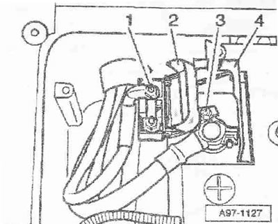 Отсоединить провод массы в АКБ при выключенном зажигании. Откинуть крышки «2» и «4» в сторону. Открутить гайку «1» и снять провод. Открутить гайку «3» блока предохранителей на плюсовой клемме и снять блок основных предохранителей.