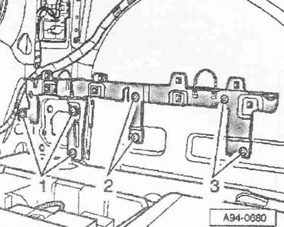 Снять левую боковую обшивку багажника. Выкрутить винты «1...3». Снять крепежную пластину с петлями.