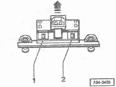 Нажать кнопки разблокировки «1» и «2» снять патрон лампы с кронштейна фонаря освещения номерного знака «стрелка». Извлечь лампу накаливания (12 В, 5 Вт) из зажимного патрона.
