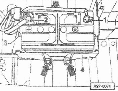 Затянуть винты «стрелки» на крепежной скобе «4» АКБ. Подсоединять клеммы АКБ при выключенном зажигании и отключенных электропотребителях в следующей последовательности. В первую очередь вручную насадить полюсный наконечник «2» положительного провода на (+) полюс АКБ и затянуть гайку. Вручную насадить полюсный наконечник «1» провода массы на (-) полюс АКБ и затянуть гайку. Насадить шланг «3» центрального газоотвода АКБ.
