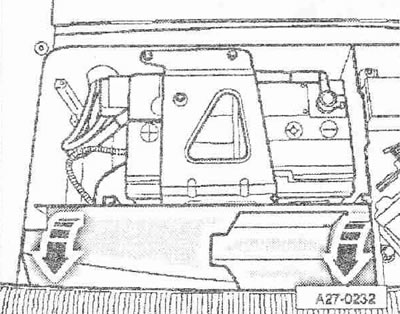 После установки проверить надежность крепления АКБ. Завершить режим буферной компенсации АКБ зарядного устройства. Если снятие и установка АКБ осуществлялись без использования режима буферной компенсации, после подключения следует провести следующие мероприятия. Активировать элементы оснащения а/м (магнитола/радионавигационная система., часы, электронные стеклоподъемники) в соответствии с руководством по эксплуатации. Деактивировать режим работы блока управления Telematik — Магнитола, телефон, навигация, самодиагностика. Проверить функционирование дистанционного радиоуправления, при необходимости, синхронизировать радиокод. Сообщить клиенту, что второй и дополнительный коды также необходимо синхронизировать, чтобы обеспечить дистанционную радиосвязь. Опросить память неисправностей всех блоков управления и при необходимости удалить сообщение о неисправности "Unterspannung/Пониженное напряжение".