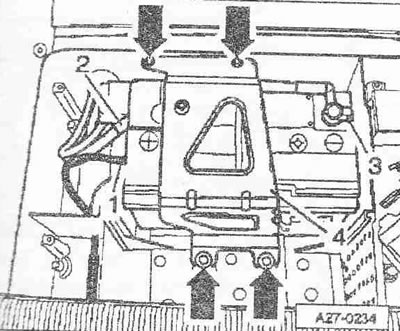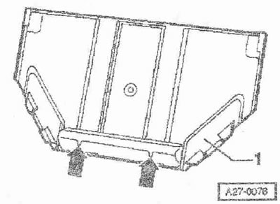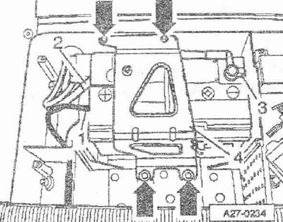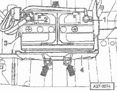 Выключить зажигание и вытащить ключ зажигания. Где требуется, извлечь пол из багажника. Откинуть коврик пола багажника вперед. А/м без держателя для аварийного колеса: Открыть крышку над выводом плюсового полюса АКБ. Подключить зарядное устройство для АКБ в режиме буферной компенсации АКБ. Отсоединить провод массы «1» и (+) провод «2» на аккумуляторе. Отсоединить шланг «3» центрального газоотвода. Где требуется, отвернуть формованный элемент перед АКБ. Выкрутить винты «стрелки» на крепежной скобе «4» АКБ.