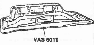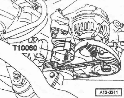 Для ослабления натяжения поликлинового ремня отклонить натяжитель накидным гаечным ключом в «направлении стрелки». Зафиксировать натяжитель поликлинового ремня с помощью оправки «Т10060 А» в отверстиях. Снять поликлиновой ремень.
