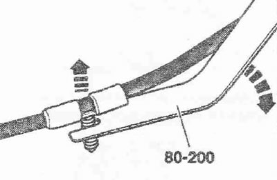 Расклипсовать держатель резонатора «4» с помощью отжимного рычага «80.200» на полке замка. Выкрутить болты «2». Снять улавливатель воды «3» в «направлении стрелки». Отсоединить шланг «1» от полки замка и корпуса воздушного воздуха. Расклипсовать держатель «5» жгута проводов на воздуховодном шланге. Для этого использовать отжимной рычаг «80. 200». Для облегчения снятия использовать при необходимости не содержащий силикон спрей.