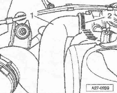 Разблокировать крепежную скобу «2» в «направлении стрелки» и снять соединительный шланг «1» к интеркулеру с впускного трубопровода. Пометить направление вращения поликлинового ремня мелом или фломастером. Изменение направления хода ранее эксплуатировавшегося ремня может привести к его повреждению.