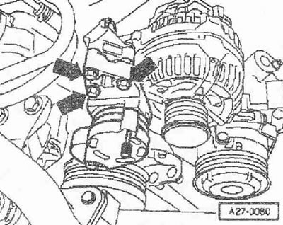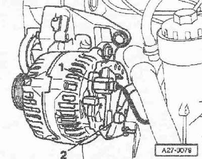 Установка в обратном порядке, при этом необходимо учесть следующее. Для облегчения установки генератора сдвинуть на втулки болтов крепления немного назад. Это должно облегчить ход втулок крепления генератора, поскольку в противном случае усилие зажима втулки, несмотря на соответствующий крутящий момент, слишком мало. Обратить внимание на правильность посадки и ход поликлинового ремня.