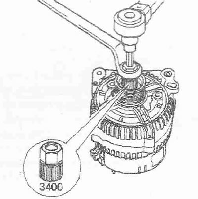 Снять генератор. При наличии снять защитный кожух на шкиве генератора. Удерживать гайку крепления с помощью зубчатого адаптера «3400» и провернуть вал генератора по часовой стрелке.