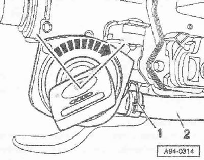 Audi А2 "31": установить рычаг селектора КП в положение "STOP". Повернуть ключ зажигания в положение "Zundung ein/Зажигание вкл." «стрелка». Затем приподнять запирающую скобу «1» и извлечь блокиратор «2» из корпуса замка зажигания. Для снятия личинки замка необходим запасной ключ без функций освещения и дистанционного управления, т.к. снятие возможно только ключом с плоской ручкой.