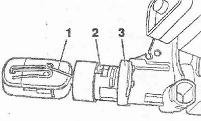Вставить стальную проволоку или штифт «1» (прибл. 1,5 мм) в отверстие до упора и при этом извлечь личинку замка «2» со считывающей катушкой из корпуса «3» замка вала рулевого управления.