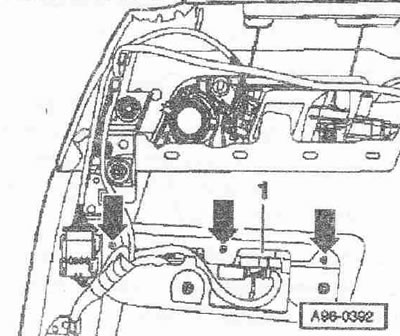 Выключить зажигание и вытащить ключ зажигания. Снять обшивку передней двери. Снять звукопоглощающий мат с обивки двери. Открутить винты «стрелки». Снять гнездо переключателя «1» с подлокотника. Отсоединить разъем.