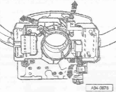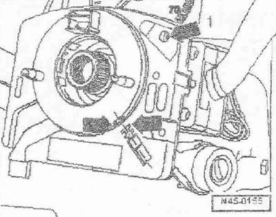 Снять подрулевой переключатель. Осторожно разблокировать фиксаторы «стрелки» и снять корпус возвратно: о кольца с контактным кольцом и датчиком угла поворота рулевого колеса «G85» с переключателя на рулевой колонке.