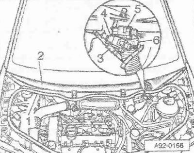 Снять рычаг стеклоочистителя. Отсоединить шланг омывателя «3». Если имеется, отсоединить разъемы «4» и «5» обогреваемых форсунок. Ослабить зажим для шланга «6» с помощью клещей для шланговых хомутов «V.A.G 1921» и снять шланг для слива воды у решетки обтекателя. Снять резиновый уплотнитель «1» решетки обтекателя. Для предотвращения раскалывания решетки обтекателя «2» при ее снятии необходимо слегка смазать мыльным раствором место перехода между ветровым стеклом и решеткой обтекателя и извлечь решетку обтекателя, начиная с края стекла, в направлении вертикально вверх.