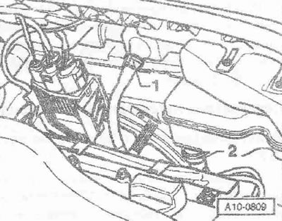 Извлечь маслоизмерительный щуп из направляющей трубки. Снять направляющую трубку «1» маслоизмерительного щупа. Поз. «2» не принимать во внимание.