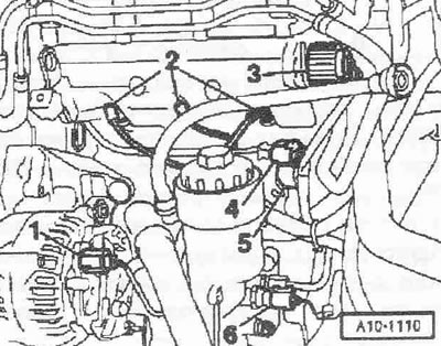 Отсоединить штекерные разъемы «2» свечей накаливания. Вытащить деблокирующий штифт и отвернуть рифленую гайку «3» центрального разъема модуля насос-форсунок. Прочие «поз.» во внимание не принимать.