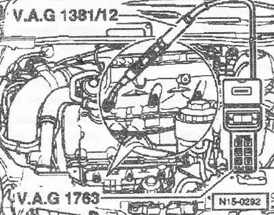 Вывернуть все свечи накаливания шарнирным ключом «3220». Привернуть адаптер «V.A.G 1381/12» на месте свечи накаливания в соответствующий цилиндр. Проверить компрессию с помощью компрессометра «V.A.G 1763». Второй механик должен вращать двигатель стартером до тех пор, пока не прекратится повышение давления по шкале прибора.