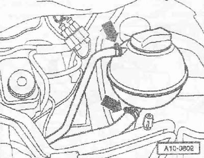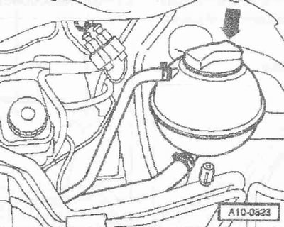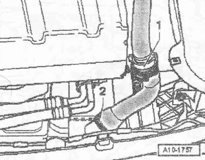 Открыть крышку «стрелка» расширительного бачка. Снять передние колеса. Снять шумоизоляцию «стрелки». Подставить поддон для сервисных кранов «VAS 6208» под двигатель. Отсоединить штекерный разъем «1» датчика указателя температуры ОЖ на выходе радиатора «G83». Снять с радиатора нижний шланг подачи ОЖ «стрелка» и слить ОЖ.