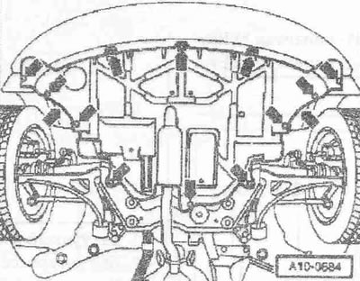 Отвернуть болты «1 и 2» примерно на 2 оборота. Гайку «3» можно ослаблять только для замены подушки двигателя.
