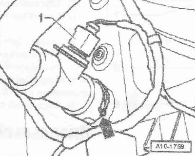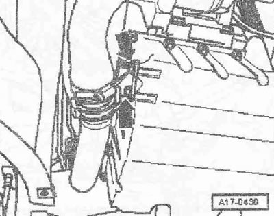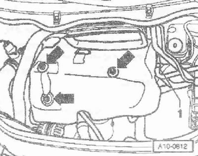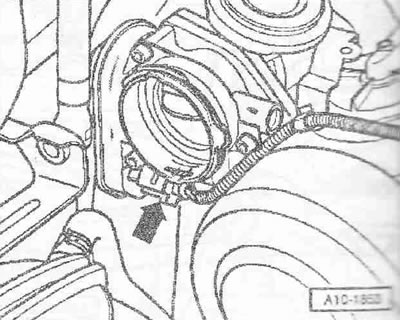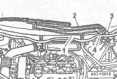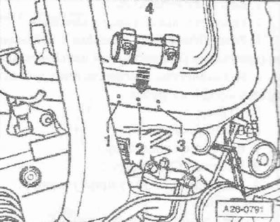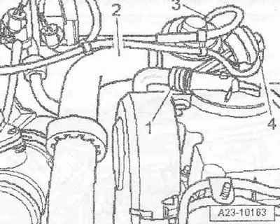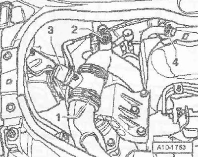 Отсоединить воздуховодный шланг «1» от расходомера воздуха «G70». Отсоединить штекерный разъем «3» расходомера воздуха «G70». Открутить гайку «2». Снять шланг «4» вентиляции картера с крышки ГБЦ. Подвытянуть воздухонаправляющий патрубок вместе с расходомером воздуха «G70».