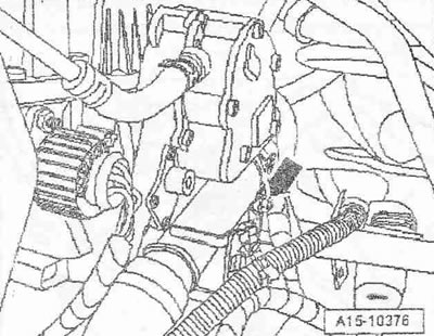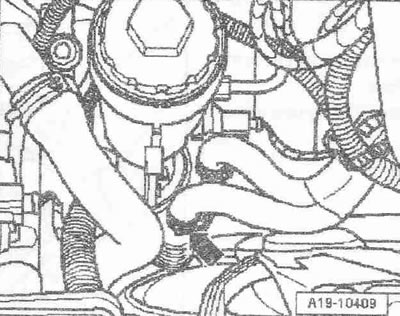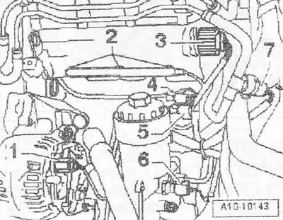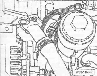 Отсоединить штекерный разъем датчика Холла «G40» поз. «4» и датчика числа оборотов двигателя «G28» поз. «5». Отсоединить штекерный разъем «6» датчика давления масла «F1». Отсоединить штекерный разъем «7» датчика температуры топлива «G81».