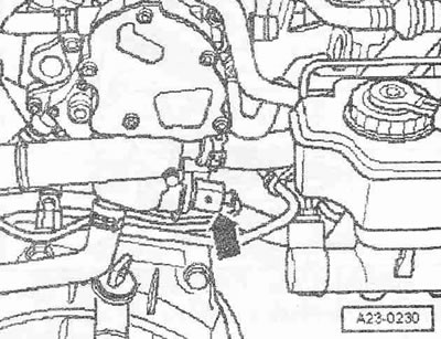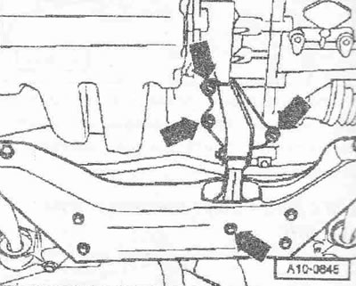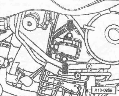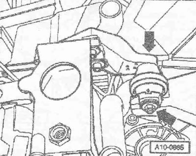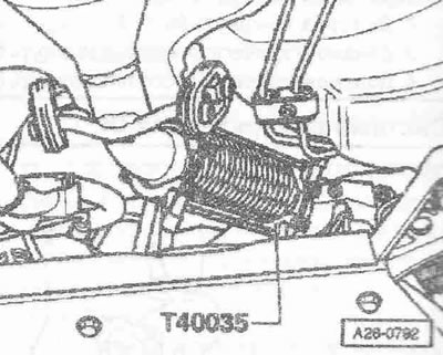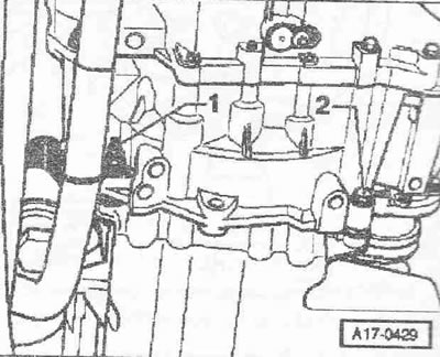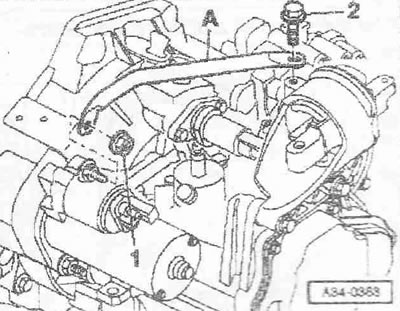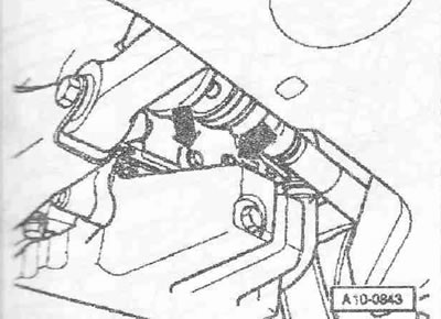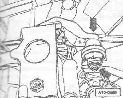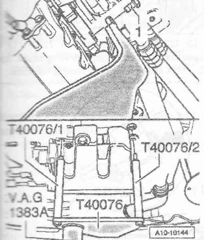 Выкрутить винт «2». Привернуть держатель двигателя «Т40076» болтом «1» моментом примерно 20 Нм к блоку цилиндров. Вставить болты держателя двигателя «Т40076» в блок цилиндров и зафиксировать болт «Т40076/2» для этого завернуть гайку моментом примерно 20 Нм. Вставить подъемник для двигателя и КП «V.A.G 1383 А» в держатель двигателя. Немного приподнять двигатель вместе с КП. Для откручивания болтов крепления использовать стремянку «VAS 5085».