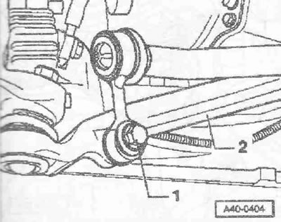 Отвернуть болт «1» стойки рычага подвески «2».