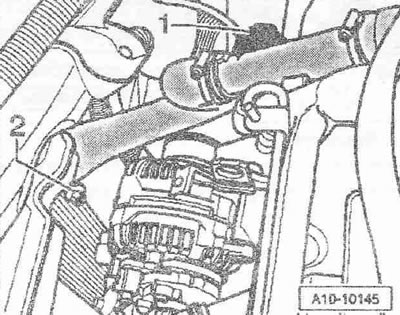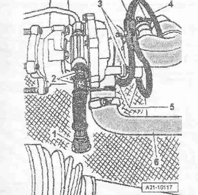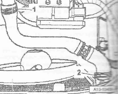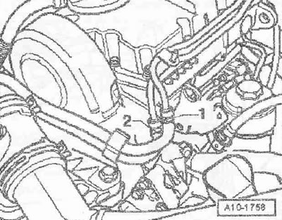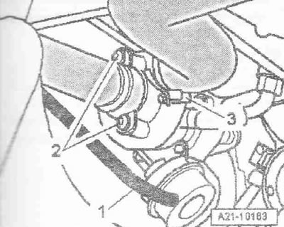 Снять вакуумный шланг «1» силового вакуумного пневмоэлемента регулирования давления наддува и отложить его. Отвернуть болты «2» и снять воздухе направляющий патрубок с турбокомпрессора. Отсоединить воздуховодный шланг «3» от турбокомпрессора.