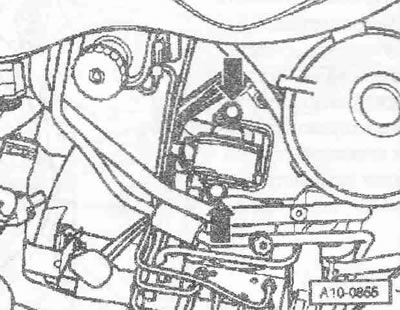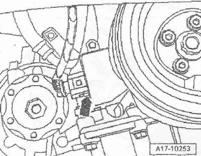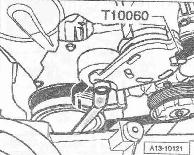 Для ослабления поликлинового ремня повернуть приспособление для ослабления ремня накидным ключом «в направлении стрелки». Зафиксировать натяжитель ремня, вставив фиксатор «Т10060 А» в фиксирующие отверстия. Снять поликлиновый ремень.