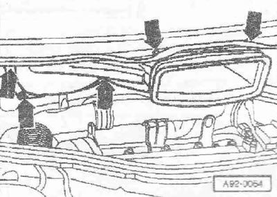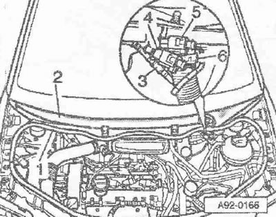 Отсоединить трубку подачи омывающей жидкости «3». При наличии, отсоединить штекерные разъемы «4 и 5» обогреваемых форсунок стеклоомывателя. Ослабить шланговый зажим «6» при помощи зажимных клещей для шлангов «V.A.G 1921» и снять дренажный шланг с решетки дефлектора. Снять резиновое уплотнение «1» решетки дефлектора. Снять решетку дефлектора «2».