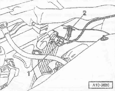 Снять правый воздуховодный шланг «2» интеркулера. Поз. «1» не принимать во внимание. Отсоединить штекерный разъем «стрелка» датчика уровня и температуры масла «G266». Раскрепить электропроводку.