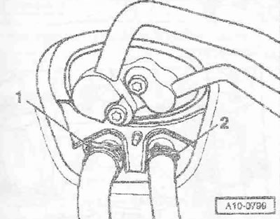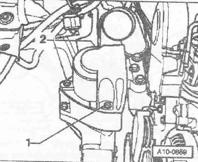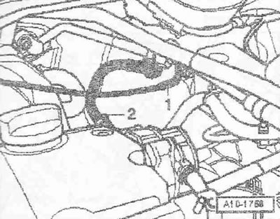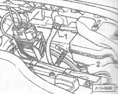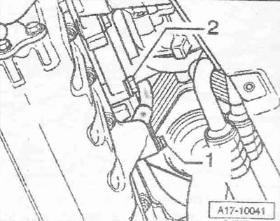 Извлечь масломерный щуп из направляющей трубки. Снять направляющую трубку масломерного щупа «1». Снять маслоналивную трубку «2» с маслоналивного бачка.