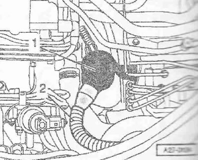 Снять вакуумный шланг «2» от тандемного насоса к усилителю тормозов. Раскрепить вакуумные шланги.