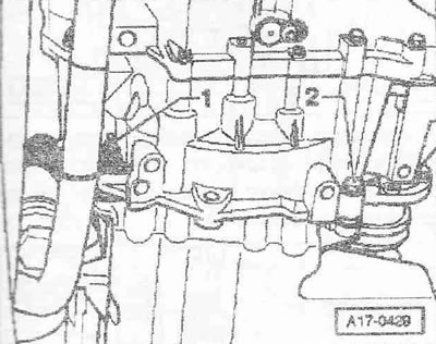 Снять крышку подушки двигателя, для этого отвернуть болты «1 и 2».