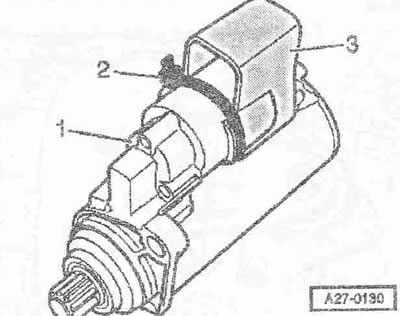 Отсоединить штекерный разъем «4» выключателя фар заднего хода «F4». Раскрепить электропроводку. Отсоединить штекерный разъем клеммы 50 «поз. 3» втягивающего реле стартера. Отвернуть гайку «2» и снять В+ провод. Отвернуть гайку «1» и снять провод массы.