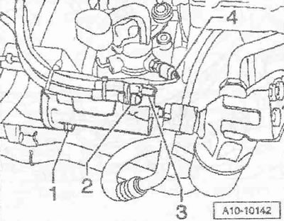 Отсоединить воздухе водный шланг «2» от механического клапана рециркуляции ОГ. Отсоединить вакуумный шланг «3» механического клапана рециркуляции ОГ. Отсоединить вакуумный шланг «4» силового вакуумного пневмоэлемента заслонки впускного коллектора. Поз. «1» не принимать во внимание.