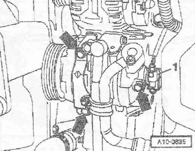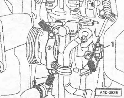 Отвернуть болты «стрелки» компрессора кондиционера. Подвесить компрессор кондиционера к рамке радиатора. Поз. «1» не принимать во внимание.