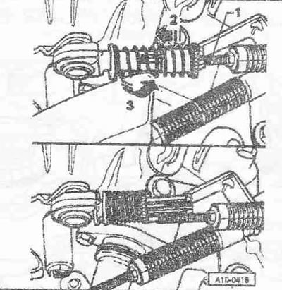 Разблокировать фиксатор тросов выбора и переключения передач, для этого до упора задвинуть подвижную втулку «в направлении стрелки» и затем зафиксировать поворотом налево «в направлении стрелки 3». Вытянуть тросы «1» из фиксатора тросов.