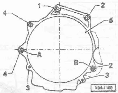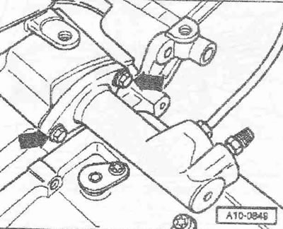 Осторожно! После снятия рабочего цилиндра сцепления на педаль сцепления больше не нажимать. Для откручивания болтов элементов крепления использовать стремянку «VAS 5085».