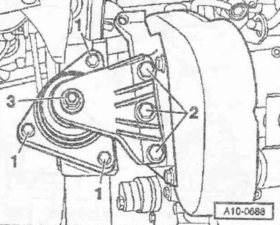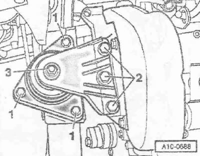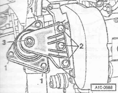Гайку «3» можно ослаблять только для замены подушки двигателя. Отвернуть болты «1 и 3» и снять кронштейн с подушкой двигателя.