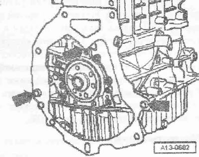 Двигатель установлен на держателе двигателя «Т40076». Установка в обратном порядке, при этом необходимо учесть: при установке заменить самоконтрящиеся гайки и болты. Заменить болты, затягиваемые на определенный угол, а также манжеты и уплотнения. Шланги и шланговый штуцеры системы наддува воздуха должны быть очищены перед монтажом от масел и смазки. Ни в коем случае не использовать смазывающих средств. Для крепления всех соединений шлангов использовать хомуты соответствующей серии. При сборке установить все кабельные хомуты на прежние места. Очистить шлицы первичного вала КП и шлицы втулок уже работавших дисков сцепления, удалить коррозию и нанести на шлицы тонкий слой смазки для шлицевых соединений дисков сцепления. Не смазывать направляющую втулку. Проверить центрирование ведомого диска сцепления. Проверить на износ выжимной подшипник сцепления, при необходимости заменить. Проверить наличие в блоке цилиндров центровочных втулок для центровки двигателя и КП, при необходимости вставить втулки. Проследить, чтобы промежуточный лист был установлен на уплотнительном фланце и был вставлен в центровочные втулки «стрелки». Привернуть КП к двигателю.