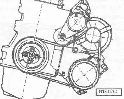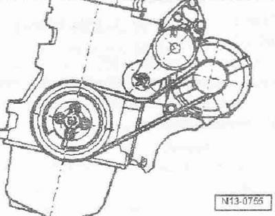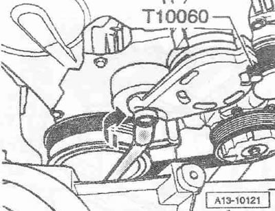 Для ослабления поликлинового ремня повернуть натяжитель ремня накидным ключом «в направлении стрелки». Зафиксировать натяжитель ремня, вставив фиксатор «Т10060 А» в фиксирующие отверстия. Снять поликлиновый ремень.