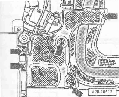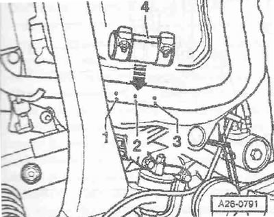 Распилить выхлопную трубу под прямым углом в месте разъема «2» цепным труборезом «VAS 6254». При монтаже установить закрепительную втулку «4» между отметками «1 и 3».