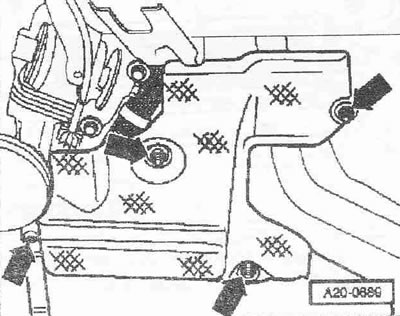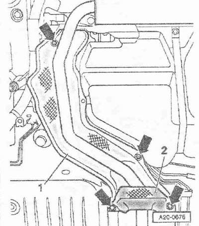 Открутить гайки «стрелки» и снять теплозащитный экран «2». Отсоединить дополнительный глушитель от обеих левых крепежных петель. Снять теплозащитный экран «1». Снова установить дополнительный глушитель. Глушитель крепить сразу же, не оставлять его висеть, опасность повреждения соединительного элемента.