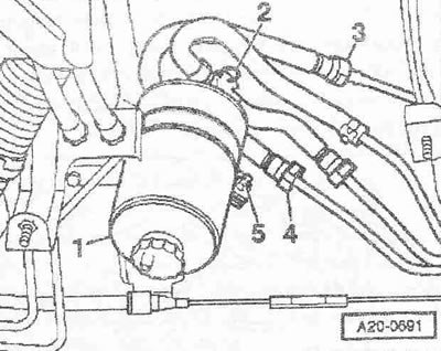 Установить ресивер под днище а/м. Снять топливные магистрали «3» и «4», для этого нажать кнопку разблокировки. Выкрутить гайку «5» на кронштейне. Отсоединить хомут и слегка опустить фильтр Снять фиксатор «2» и снять регулировочный клапан с подключенными магистралями. Переустановить топливные магистрали со старого на новый топливный фильтр. Пористые топливные магистрали подлежат замене.